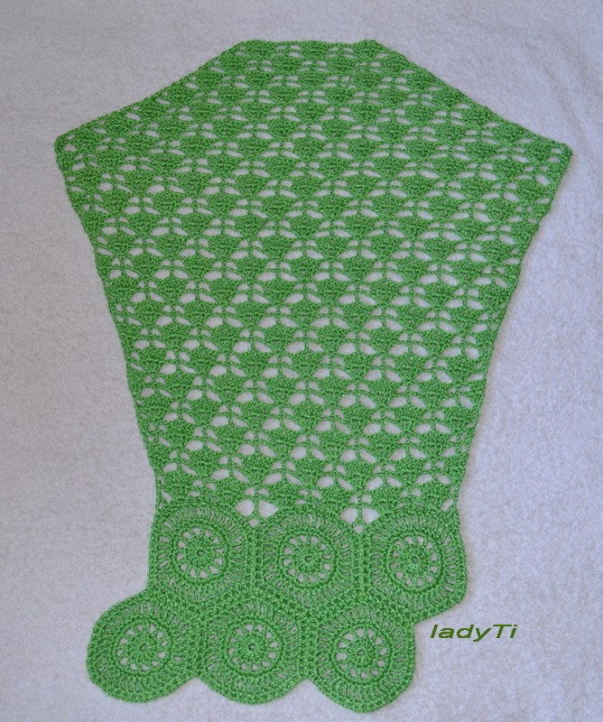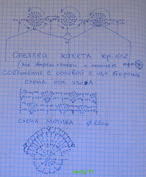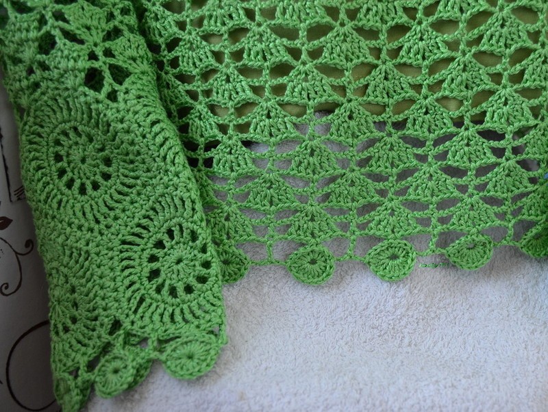 Соедините полоски мотивов к столбикам, затем продолжайте вязать основным узором по схеме, вдоль другой стороны части столбиков, выполняя убавления со стороны горловины.