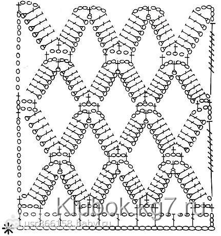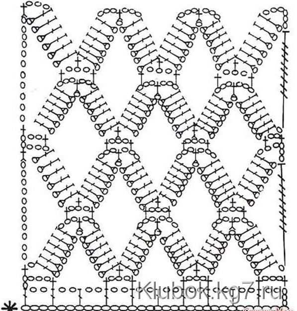 Лучше всего вязать снизу вверх, так легче рассчитать количество необходимых раппортов. Ширина раппорта равна 9 ВП по начальной цепочке.