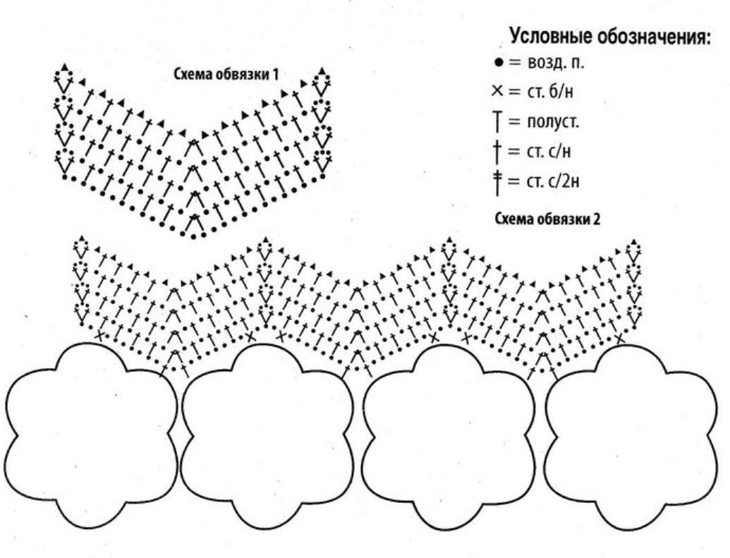 Основные узоры: ажурный узор - вязать по схеме 1. Число возд. п. кратно 13 + 2 + 9 + 3 возд. п. для подъема. Повторять с 1-го по 2-й ряд; кайма для рукавов и низа кофточки - вязать по схеме обвязки 1 круговыми рядами; для пелерины - вязать по схеме обвязки 2 круговыми рядами; роза - вязать по схеме 2. Роза состоит из 3 ярусов. Стрелками указаны места, в которые следует провязывать ст. б/н.