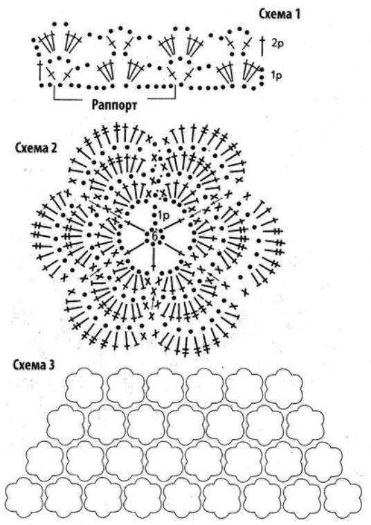 Пелерина: свяжите 60 роз по схеме 2. Сшейте из них две детали пелерины, располагая розы по схеме 3. Соедините обе детали пелерины по боковым скосам.