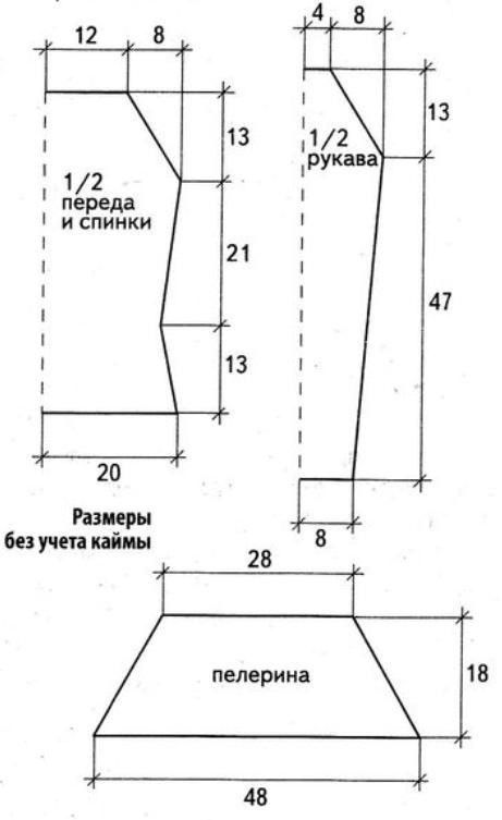 Сборка: выполните швы реглана, боковые швы и швы рукавов. Обвяжите низ кофточки и рукавов по схеме обвязки 1. Обвяжите нижний край пелерины по схеме обвязки 2. Пришейте верхний край пелерины к вырезу горловины.