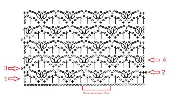 Свяжите образец, набрав цепочку из 43 воздушных петель. И провяжите 5 полос узора с веерочком, как на схеме 1. Так у вас будет возможность понять, насколько плотно или слабо вы вяжете. Ширина этого образца должна быть 14 см, а высота 7,5 см.