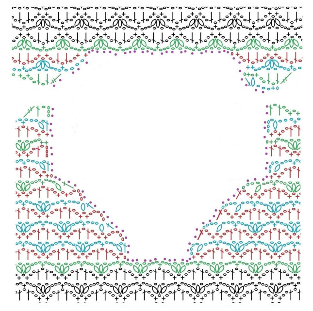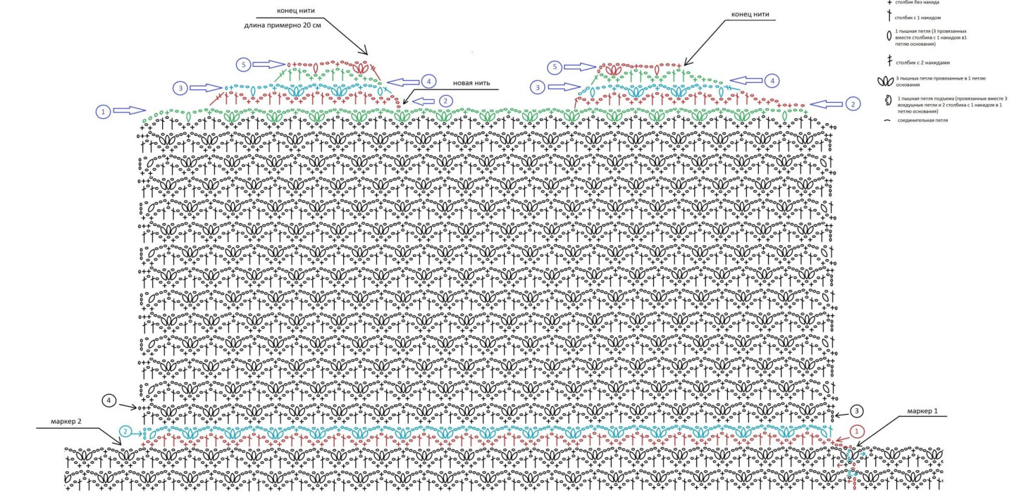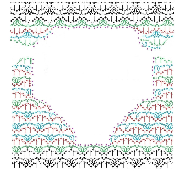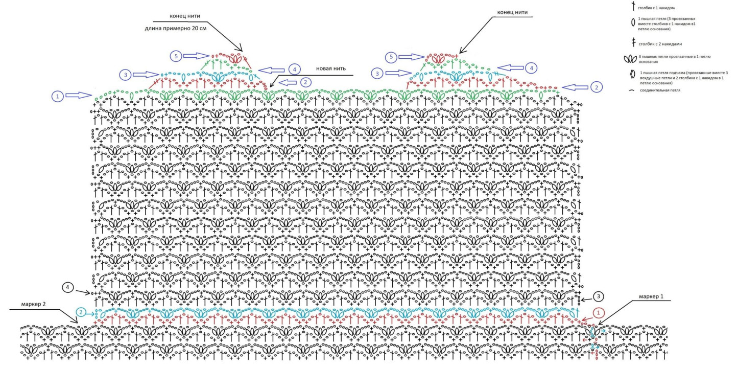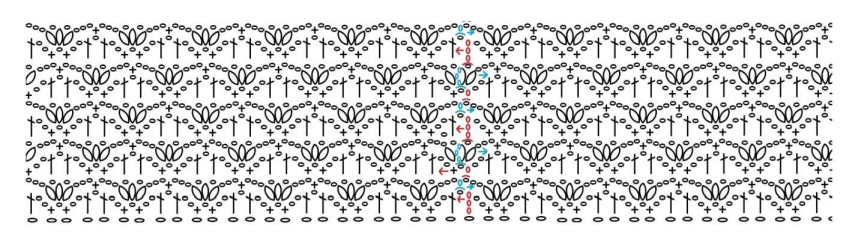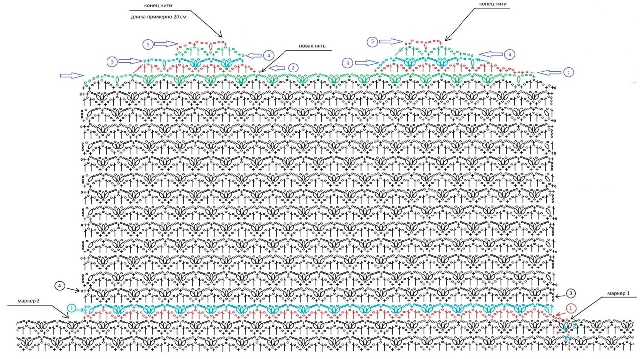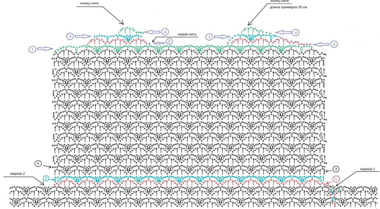 Перед мы начинаем вязать по схеме 4., также оставляя не провязанными по 1 веерочку, которые мы отметили маркерами. Первые 2 ряда так же будут идти с уменьшением петель под проймы. На схеме эти ряды выделены цветом. Далее мы вяжем основным узором без изменений. Нам нужно провязать: