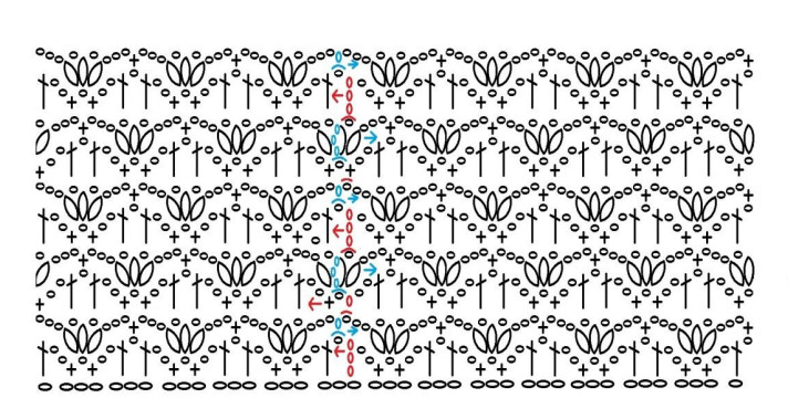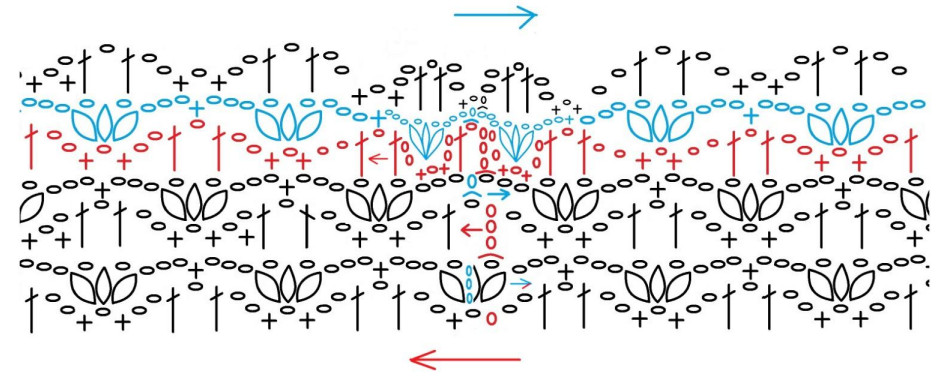 Вязать будем поворотными рядами. То есть когда вы закончите первый ряд узора, провязали петлю подъема, мы поворачиваем вязание и вяжем в обратном направлении. И так каждый последующий ряд. Как провязываются петли подъема согласно рисунку и направление вязания показано на схеме 2.