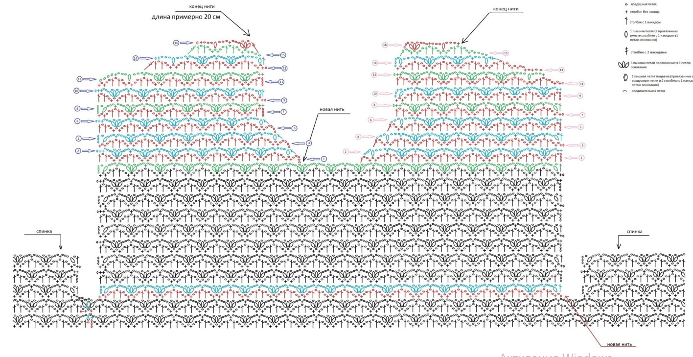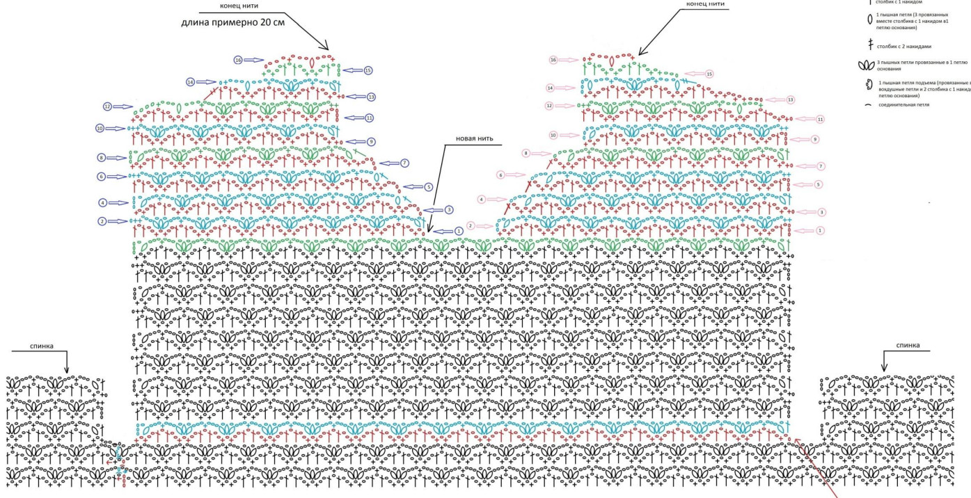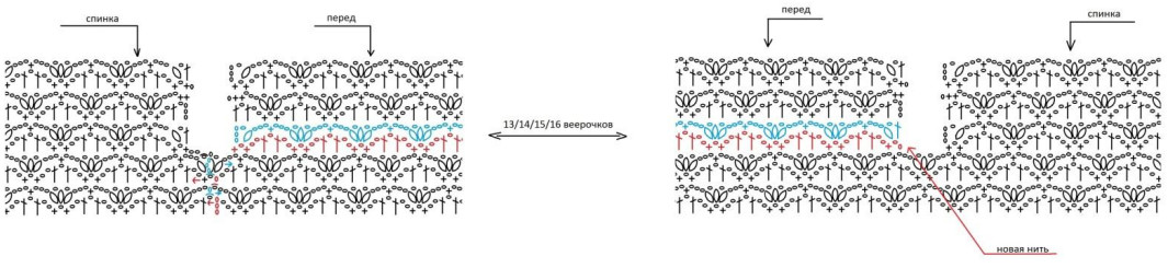 Спинку мы начинаем вязать по схеме 3. оставляя не провязанными по 1 веерочку, которые мы отметили маркерами. Первые 2 ряда спинки будут идти с уменьшением петель под проймы. Далее мы вяжем основным узором без изменений. Нам нужно провязать: