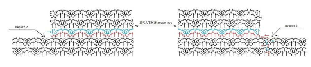 в 15 и 16 рядах делаем прибавку 1 веерочка по схеме 6. Теперь у нас 12 веерочков в ширину.