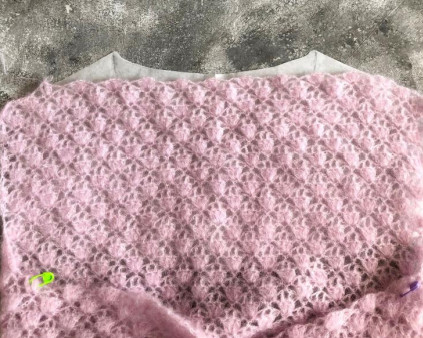 Теперь определяем лицевую сторону джемпера. Если вы присмотритесь, то у веерочков есть более выпуклая сторона. При вывязывании веерочков в процессе они повернуты к нам изнаночной стороной. То есть следующий ряд мы вяжем по лицевой стороне, а веерочки всегда по изнаночной. Надеваем маркер так, чтобы он висел основной частью на лицевой стороне джемпера.