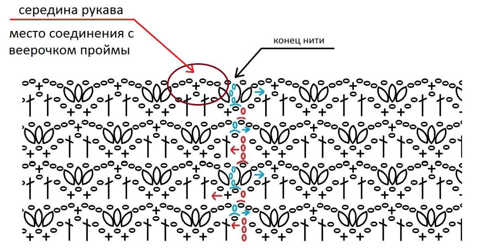 Рукав мы так же, как и плечевые швы, пришиваем крючком полустолбиками без накида . Сшивать лучше всего начать от плечевого шва.