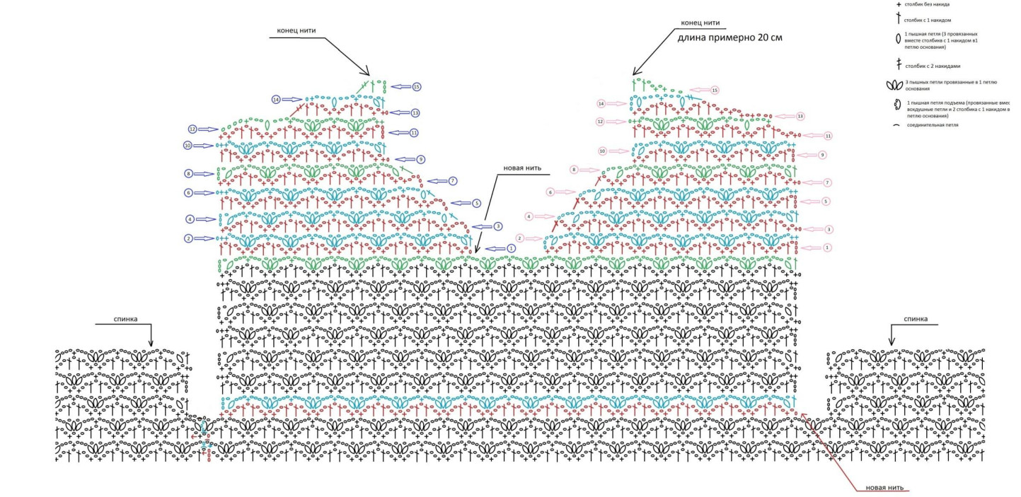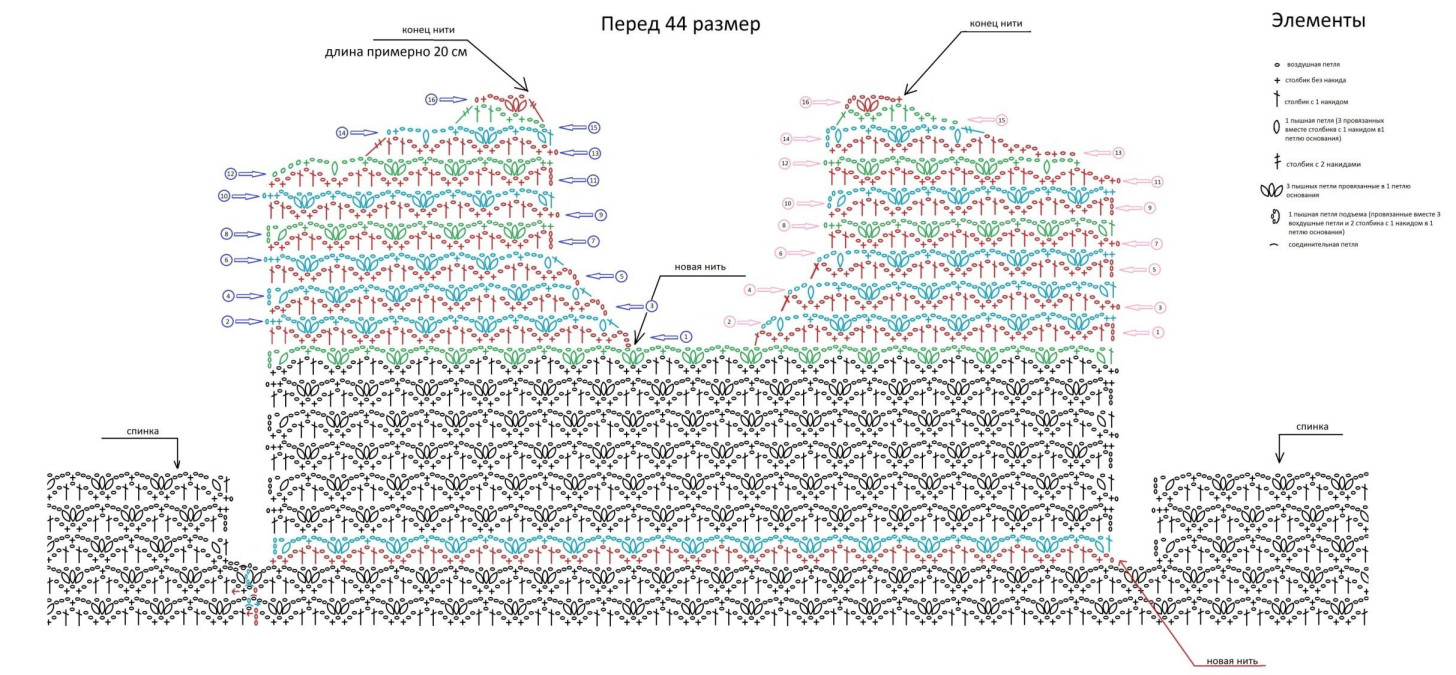 С 25/29 ряд мы начинаем формировать плечевые скосы и горловину. Все убавки изображены на схемах ниже, нужно только выбрать свой размер. Ряды, в которых происходят какие либо изменения, для наглядности на схеме изображены цветом и пронумерованы.