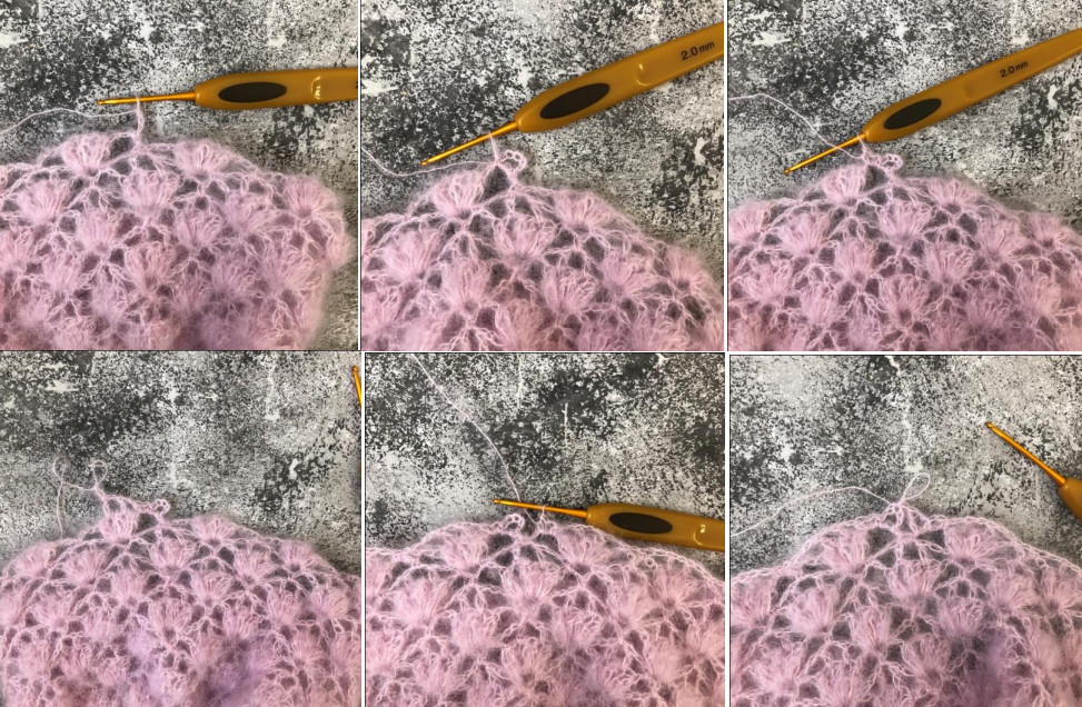1 пышная петля подъема ( провязанные вместе 3 воздушные петли и столбика с одним накидом в 1 петлю основания)
