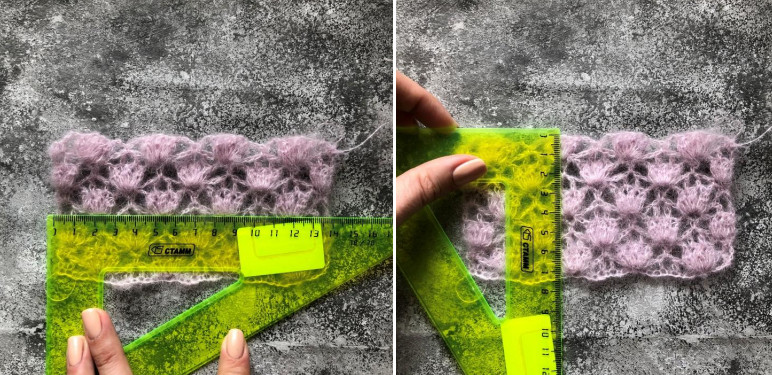 Если вы НЕ попали в мою плотность, меняйте размер крючка до тех пор, пока плотность не совпадет. Если образец получился меньше 14 см, меняйте крючок на больший размер. Если больше 14 см, то на меньший размер крючка.