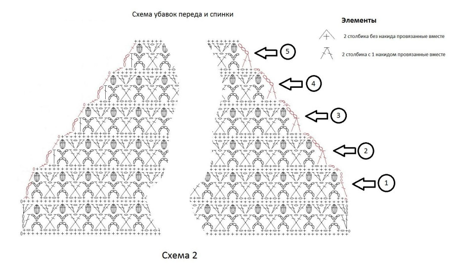С 57 ряда для формирования реглана начинаем вязать убавления с обеих сторон по схеме 2. Все элементы убавок на схеме обозначены красным цветом. Для размеров: