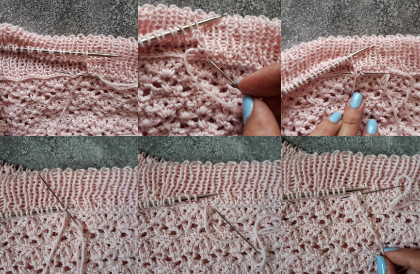 Для обработки горловины необходимо к верхушке шва правого рукава джемпера прикрепить нить от нового клубка.
