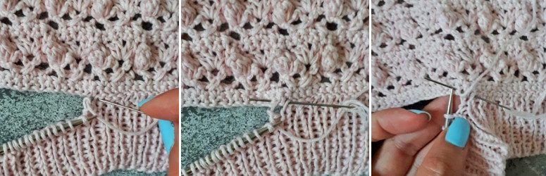 На высоту ряда, связанного из столбиков с накидом, делаются два прокола иглой. При сшивании ряда из СБН сшиваются по 1 петле.