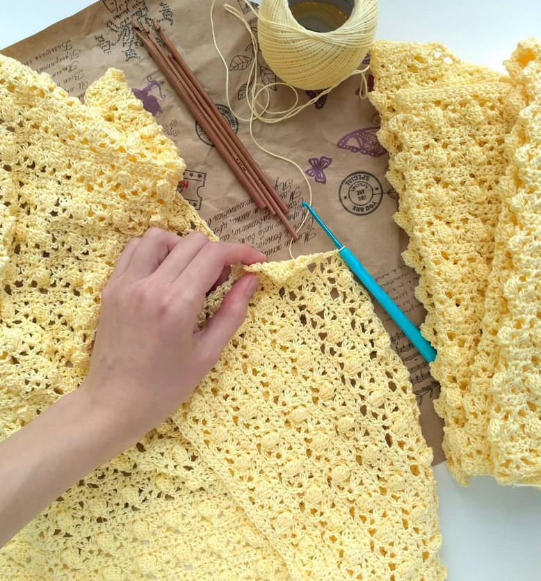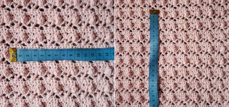 Если вы НЕ попали в мою плотность, меняйте размер крючка, до тех пор, пока плотность не совпадет с моей. Если в 10 см больше чем 25 петель узора, меняйте крючок на больший размер. Если меньше чем 25 петель, то на меньший размер крючка.