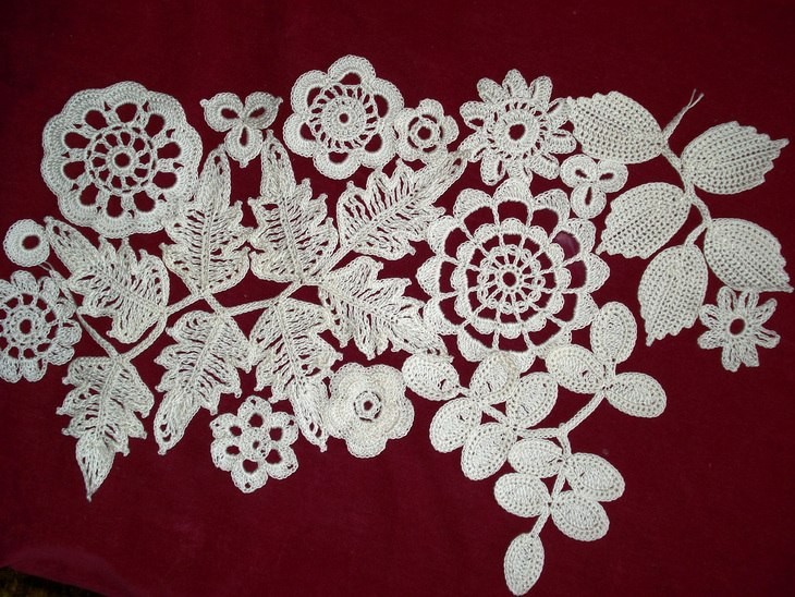 От груди платье вяжется по круговой, постепенно расширяясь от колена к низу. Вставки на спине, шлейф и подол платья выполнены техникой ирландского вязания. Платье посажено на подкладку, на левом боку - молния. Пояс вяжется отдельно, сажается на ленту и затем пришивается к платью.