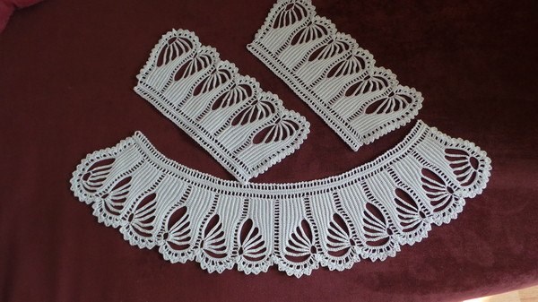 Попросили связать воротничок и манжеты для школьницы.Выбрала модель,в процессе вязания поняла, что очень долго буду вязать, т. к. и нитки тоненькие и вязание в основном ст.б.н., ну все-таки не сдалась, довязала! Когда вяжешь для себя, не заморачиваешься сроками, а на заказ время подгоняет. Пряжу покупала в Китае, сказали, что это лен, но им верить не стоит, так что состав неизвестен. Комплект получился, как накрахмаленный, хотя я его только отпарила .