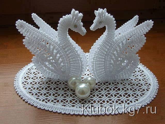 Первый вариант: Лебеди связаны в технике брюгкского кружева. Не пугайтесь это не так и сложно как может показаться в начале.Галина Моденова рассказывает как связать этих прекрасных чудо-птиц — лебедей: Сама работа относится к несложным, однако требуется хотя бы небольшой опыт. чтобы к ней приступить. Для начала вы должны быть ознакомлены с основами вязания, знать, что такое воздушные петельки, а также столбики без накида и с накидом. Вязание лебедя начнем с его тела. Делаем первый ряд — две воздушные петельки, шесть столбиков с накидом во вторую петлю от крючочка. Второй ряд будет таким – 6 прибавлений к тому же рисунку (12). Переходим сразу же к третьему ряду – тут будет столбик без накида, прибавка) * 6 (18). Четвертый ряд — связать два столбца без накида, прибавление * 6 (24). Ряд номер пять будет таким — три столбика бн, прибавка * 6 (30). Шестой ряд — четыре столбца б/н, прибавка * 6 петель (36). В седьмом ряду будет 5 сбн, прибавка * 6 (42). А когда вы будете делать с восьмого по 15й ряд – делайте столбики без накида по кругу. Дальше продолжаем вязать шею птицы, которая, к тому же, должна быть связана без отрыва от тела. Используйте 8 из 42 петель седьмого ряда, провязав восемь сбн и соединив их в небольшую «трубочку»... после чего делаем с первого по семнадцатый ряд столбиками по кругу. Чтобы сделать клюв – меняем нитку на другую, желтого цвета. Дальше вяжем с восьмого по 24-й ряд по кругу столбиками без накида и завершаем вязание. Хорошо, если вы сделаете единый каркас из проволоки для тела и шеи лебедя. В теле должна быть петелька, в противном случае, лебедь будет валится в бок. Каркас вставляем во внутрь, слегка набиваем тело и сшиваем его, сложив пополам