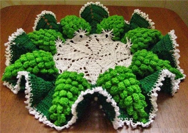 8 круг: Присоединить зеленую нить, в то же место СС, 6 ВП, * в том же месте сделать (С2Н, 2ВП) 6 раз и С2Н; 5ВП, пропустить 3 С2Н следующей группы, 5 С2Н в следующие С2Н, 3ВП Пропустить 3 С2Н, 5 С2Н в следующие С2Н, 5ВП, С2Н в центральный С2Н следующей груп-пы, 2ВП. Повторять от * вокруг, присоединиться и разорвать.