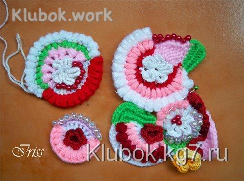 Берем еще 2 цветочка (лучше поменьше) и так же обвязываем их за задние стенки 1 рядом столбиков