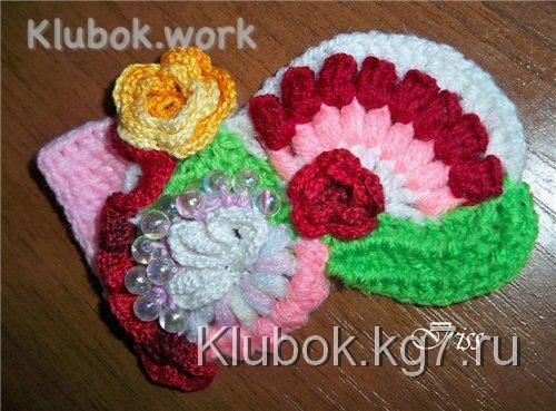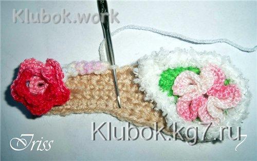Этой же нитью вяжем шнур-гусеничку, достаточной длины, чтобы соединить 2 цветочка у основания и у края уха. длину шнура-гусенички определям примеркой! и привязываем шнур столбиками без накида к 1-му мотивчику (фото 8)