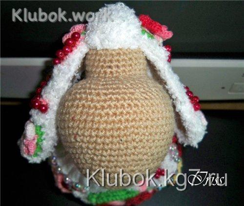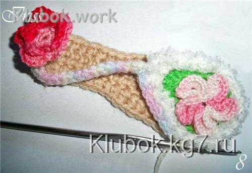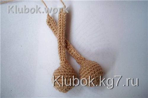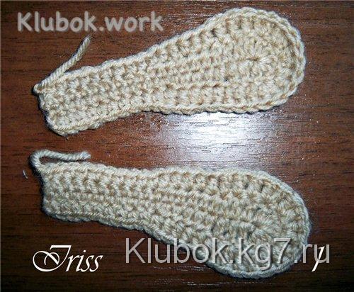 нам придется постоянно сверять нашу вязку с уже связанным ушком и корректировать количество рядов обвязки и количество накидов в столбиках.