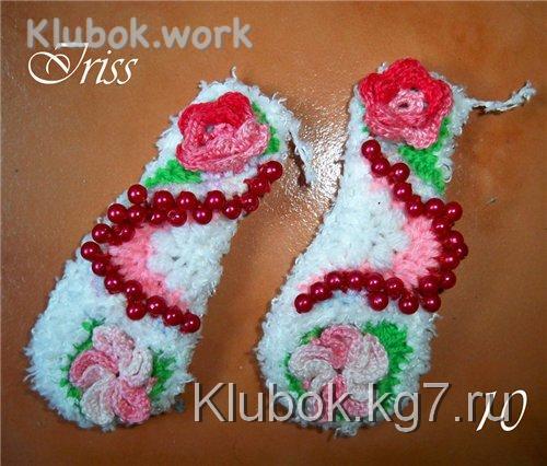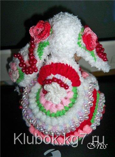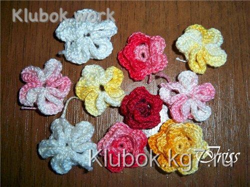 А теперь начнем украшать овечку. Для начала навяжем несколько цветочков. можно разных, можно одинаковых