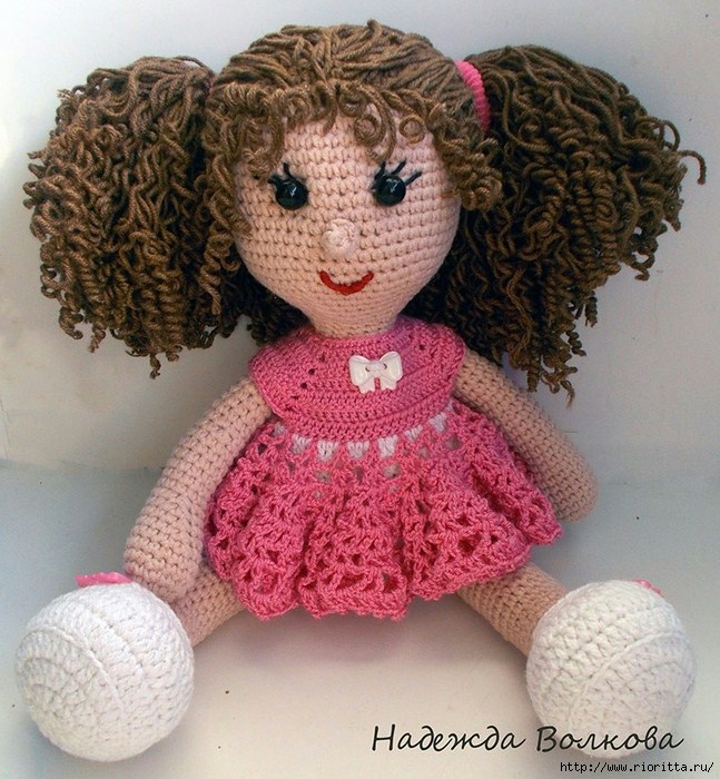 Выворачиваем, одеваем на куклу и крепко пришиваем по краю. Чтоб волосинки нам не мешали, завяжите их в хвост.