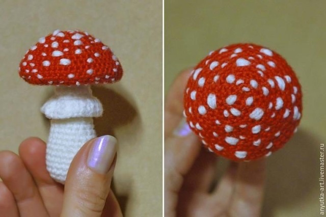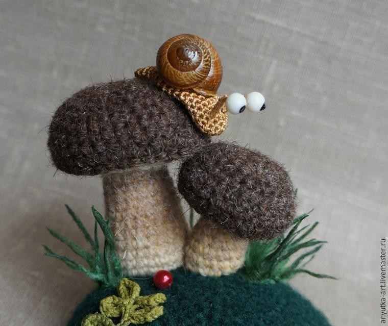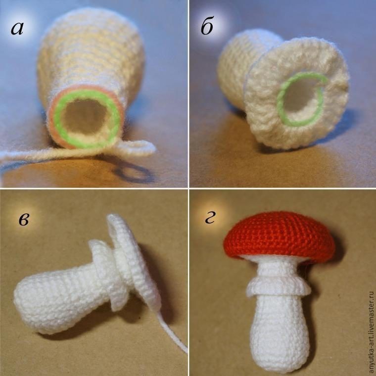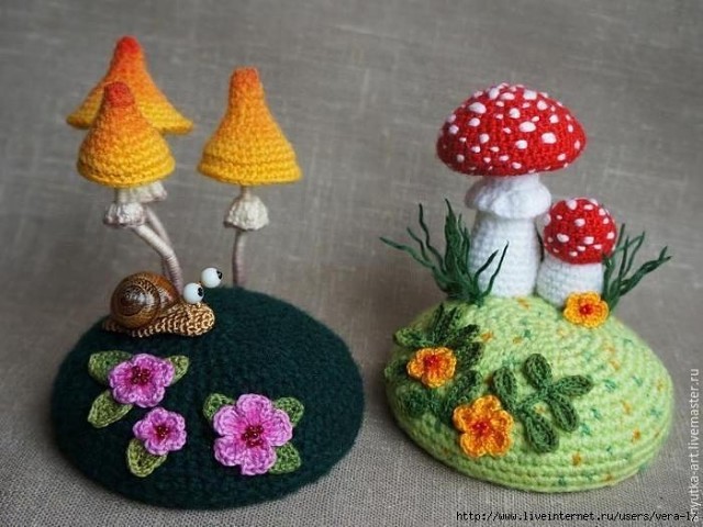Игольницы-грибочки.Klubokhttp://klubok.work/2/46/7517/Klubokhttps://klubok.work/css/image/top-logo-en.pngВ зимние пасмурные дни такая игольница будет напоминать вам (или тому, кому вы ее подарите) о солнышке, лесе, запахе лесной подстилки и грибах. К тому же это весьма полезная вещица на столе каждой рукодельницы. Смотрите её подробный мастер-класс по созданию такого симпатичного чуда! Материалы: жестяная, завинчивающаяся крышка для консервирования (основа игольницы); пряжа зеленого цвета; пряжа разных цветов для грибов; тонкая пряжа для листиков и цветочков (лучше всего подойдет хлопок — «Ирис», «ромашка», «coco», «rose» и т. п); бисер (для серединки цветов); наполнитель; лоскут ткани. Лучше взять ткань средней плотности, зеленого цвета или нейтральных цветов (я использовала лен); мононить или тонкие нитки в тон пряже; клей ПВА; проволока клей универсальный (я использовала «Момент Кристалл»). По желанию: акриловые краски; черный акриловый контур; раковина улитки; две бусины для глазок улитки; лак. Инструменты: вязальные крючки; швейная игла; игла для бисера; ножницы; кисти для клея, краски, лака. Термины и сокращения в тексте: прибавка — два столбика в одну петлю; убавка — две петли провязываем вместе; сбн — столбик без накида. Основу игольницы и детали грибов вяжем по спирали (без петель подъема). Как вязать основу игольницы, мы разобрали в первой части мастер-класса. Для этих игольниц основа вяжется так же. Только листики и цветочки пришиваем уже после того, как основа-кочка полностью готова. Если вам пока еще сложно вязать мелкие детали из тонкой пряжи, то вы можете украсить игольницу также, как украшали игольницу с подосиновиками — цветы и веточки вышить. Игольница "Мухоморы" Мухоморы я вязала из пряжи Alize baby wool (175 м/50 г, 40% шерсть, 40% акрил, 40% бамбук). Большой мухомор 1) Шляпка 1-й ряд: 6 сбн в кольцо амигуруми; 2-5-й ряды: по 6 прибавок в каждом ряду =30 сбн; 6-9-й ряды: по 5 прибавок в каждом ряду =50 сбн; 10-12-й ряды: по 50 сбн. 2) Ножка с воротничком 1-й ряд: 6 сбн в кольцо амигуруми; 2-4-й ряды: по 6 прибавок в каждом ряду =24 сбн; 5-8-й ряды: по 24 сбн; 9-10-й ряды: по 2 убавки в каждом ряду =20 сбн; 11-й ряд: 20 сбн; 12-13-й ряды: по 2 убавки в каждом ряду =16 сбн; 14-16-й ряды: по 16 сбн; 17-й ряд: На ближних (лицевых) полупетлях, вяжем воротничок (фото а, лицевые полупетли обозначены розовым цветом). Провязываем в каждую полупетлю по 2 столбика с накидом. Замыкаем провязав соединительный столбик. Нить отрезаем и «хвостик» прячем в толщу полотна. Воротничок готов (фото б). Присоединяем пряжу и вяжем 16 сбн на дальних (изнаночных) полупетлях (на фото а, б, изнаночные полупетли обозначены зеленым цветом). Далее вяжем за обе полупетли. 18-19-й ряды: по 1 убавке в каждом ряду =14 сбн. Если вы хотите, чтобы нижняя часть шляпки более четко отделялась от ножки, то провяжите первый ряд с прибавками, на ближних полупетлях (в нашем случае это 20-й ряд). Затем вяжите как обычно, за обе полупетли. 20-24-й ряды: по 6 прибавок в каждом ряду =45 сбн; 25-й ряд: 5 прибавок =50 сбн; Ножка готова (фото в) Собираем мухомор аналогично тому, как собирали большой подосиновик (фото г). 1) Шляпка 1-й ряд: 6 сбн в кольцо амигуруми; 2-4-й ряды: по 6 прибавок в каждом ряду =24 сбн; 5-8-й ряды: по 24 сбн; 9-й ряд: 4 убавки =20 сбн. 2) Ножка 1-й ряд: 6 сбн в кольцо амигуруми; 2-3-й ряды: по 6 прибавок в каждом ряду =18 сбн; 4-й ряд: 2 прибавки =20 сбн; 5-й ряд: 20 сбн; 6-7-й ряды: по 2 убавки в каждом ряду =16 сбн; 8-9-й ряды: по 16 сбн. Мухом