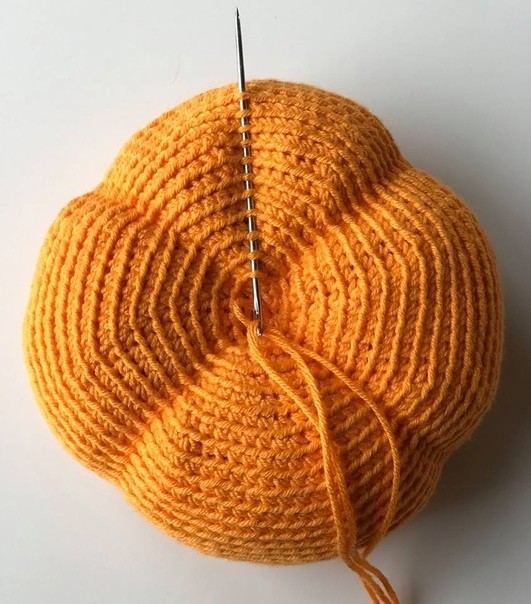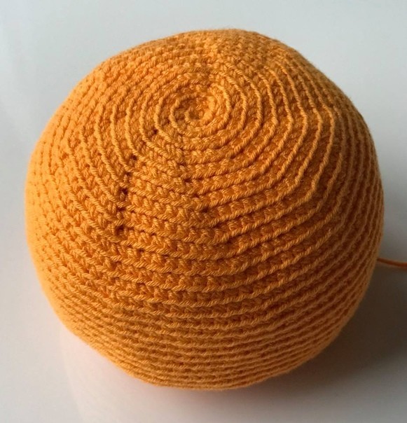 Материалы : 1) Пряжа для вязания тыквы GAZZAL BABY COTTON оранжевого цвета. 2) Пряжа для вязания черенка, усов и листика коричневого цвета (пряжа должна быть в два раза тоньше, чем для тыквы). 3) Клей ПВА. 4) Крючок, игла, ножницы. 5) Нитки коричневого цвета для сшивания. 6) Наполнитель Условные обозначения : вп - воздушная петля. сбн - столбик без накида. пс - полустолбик. сс - соединительный столбик. пп - пропустить одну петлю. п2п - пропустить две петли. прибавка - 2 сбн связать из одной петли. убавка - 2 сбн связать вместе. (....)* - повторять указанное количество раз. (....) - количество столбиков в ряду или количество рядов. Тыква Тыква вяжется за правую дугу петли, по кругу. 1) 8 сбн в кольцо амигуруми. 2) Прибавка*8 (16 сбн). 3) (1 сбн, прибавка)*8 (24 сбн). 4) (2 сбн, прибавка)*8 (32 сбн). 5) (3 сбн, прибавка)*8 (40 сбн). 6) (4 сбн, прибавка)*8 (48 сбн). 7) (5 сбн, прибавка)*8 (56 сбн). 8) (6 сбн, прибавка)*8 (64 сбн). 9) (7 сбн, прибавка)*8 (72 сбн). 10) 72 сбн. 11) (8 сбн, прибавка)*8 (80 сбн). 12)-13) 80 сбн. 14) (9 сбн, прибавка)*8 (88 сбн). 15)-25) 88 сбн (11 рядов). 26) (убавка, 9 сбн)*8 (80 сбн). 27)-28) 80 сбн. 29) (убавка, 8 сбн)*8 (72 сбн). 30) 72 сбн. 31) (убавка, 7 сбн)*8 (64 сбн). 32) (убавка, 6 сбн)*8 (56 сбн). 33) (убавка, 5 сбн)*8 (48 сбн). 34) (убавка, 4 сбн)*8 (40 сбн). 35) (убавка, 3 сбн)*8 (32 сбн). Набить тыкву. Набивать лучше не слишком плотно. 36) (убавка, 2 сбн)*8 (24 сбн). 37) (убавка, 1 сбн)*8 (16 сбн). 38) убавка*8 (8сбн). Оставшееся отверстие стянуть иголкой, оставить длинную нить для утяжки. Получился шар. Теперь надо сделать утяжки, чтобы придать ему форму тыквы. Первая утяжка делается в центре.