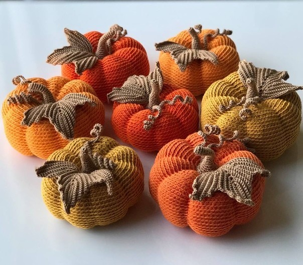 Утяжки могут быть разные по ширине, это предаст вязаной тыкве большее сходство с настоящей тыквой. Усы Вяжутся два элемента, 7 и 10 см. 1) Связать цепочку из вп 7 см. 2) сбн. 3) Развести водой клей ПВА 1:1, смочить полученным раствором связанные элементы, придать им форму и высушить. Черенок 1) Связать 8 сбн в кольцо амигуруми. 2)-5) 8 сбн ( 4 ряда). 6) 3 сс, 5 сбн. 7) 8 сбн. 8) 3 сс, 5 сбн. 9) 8 сбн. 10) 3 сс, 5 сбн. 11) 8 сбн. 12) (3 сбн, прибавка)*2 (10 сбн). 13)-14) 10 сбн. 15) (4 сбн, прибавка)*2 (12 сбн). 16) 12 сбн. 17) (2 сбн, прибавка)*4 (16 сбн). 18) (1 сбн, прибавка)*8 (24 сбн). 19) 24 сбн. Листочек Столбики вяжутся за правую дугу петли начиная с 3 ряда. 1) 16 вп. 2) П2п, 14 сбн, 4 вп, 14 сбн ( обвязать воздушные петли первого ряда с другой стороны), 1 вп. 3) Пп, 13 сбн, в арку из воздушных петель предыдущего ряда 2 сбн 4 вп 2 сбн, 11 сбн, 1 вп. 4) Пп, 12 сбн, в арку 2 сбн 4 вп 2 сбн, 12 сбн, 1 вп. 5) Пп, 13 сбн, в арку 2 сбн 4 вп 2 сбн, 11 сбн, 1 вп. 6) Пп, 12 сбн, в арку 2 сбн 4 вп 2 сбн, 12 сбн, 1 вп. 7) Пп, 13 сбн, в арку 2 сбн 4 вп 2 сбн, 12 сбн, 1 вп. 8) Пп, 13 сбн, в арку 2 сбн 4 вп 2 сбн, 12 сбн, 1 вп. 9) Пп, 13 сбн, в арку 2 сбн 4 вп 2 сбн, 12 сбн, 1 вп. 10) Пп, 13 сбн, в арку 5 сбн, 12 сбн. 11) 5 вп, п2п, 8 сбн, 1 вп, пп, 1 сбн за две дуги петли, 1 вп. 12) Повернуть вязание, 1 сбн в воздушную петлю предыдущего ряда, 9 сбн. 13) 5 вп, п2п, 14 сбн, 1 вп, пп, 1 сбн за две дуги петли, 1 вп. 14) Повернуть вязание, 1 сбн в воздушную петлю предыдущего ряда, 15 сбн. 15) 4 сбн, п2п, 19 сбн, 1 вп, пп, 1 сбн за две дуги петли, 1 вп. 16) Повернуть вязание, 1 сбн в воздушную петлю предыдущего ряда, 17 сбн, 1 вп. 17) Пп, 18 сбн, 1 вп, пп, 1 сбн за две дуги петли, 1 вп. 18) Повернуть вязание, 1 сбн в воздушную петлю предыдущего ряда, 15 сбн, 1 вп. 19) Пп, 16 сбн, пп, 3 сбн за две дуги петли, 14 сбн. 20) 5 вп, п2п, 8 сбн, 1 вп, пп, 1 сбн за две дуги петли, 1 вп. 21) Повернуть вязание, 1 сбн в воздушную петлю предыдущего ряда, 9 сбн. 22) 5 вп, п2п, 14 сбн, 1 вп, пп, 1 сбн за две дуги петли, 1 вп. 23) Повернуть вязание, 1 сбн в воздушную петлю предыдущего ряда, 15 сбн. 24) 4 сбн, п2п, 19 сбн, 1 вп, пп, 1 сбн за две дуги петли, 1 вп. 25) Повернуть вязание, 1 сбн в воздушную петлю предыдущего ряда, 17 сбн, 1 вп. Пп, 18 сбн, 1 вп, пп, 1 сбн за две дуги петли, 1 вп. 27) Повернуть вязание, 1 сбн в воздушную петлю предыдущего ряда, 15 сбн, 1 вп. 28) Пп, 16 сбн, 1 вп, пп, 1 сбн за две дуги петли, 1 сс, нить обрезать и спрятать.