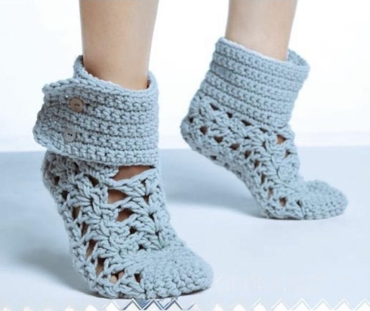 From the top of the toe, crochet 3 chains to begin, 1 double crochet into the 2nd stitch, 2 chains, skip 2 stitches, 2 double crochets together, repeat from * to * to the end of the row. Turn.
