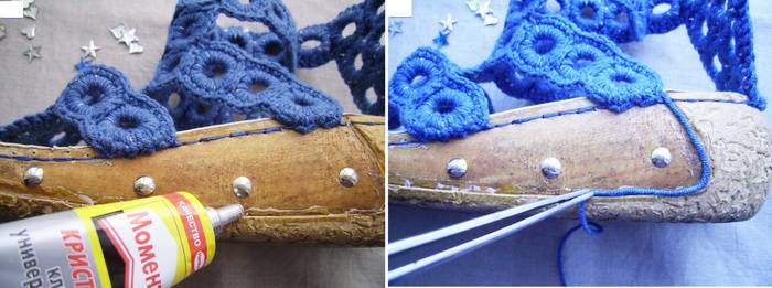 13. Чтобы придать нашему изделию более нарядный вид, будем декорировать подошву. Используем для этого универсальный прозрачный клей, пряжу, из которой связана верхняя часть сандалий, и паетки в виде звездочек и сердечек. Наносим клей в виде ленточки с внутренней и наружной стороны подошвы. С помощью пинцета аккуратно крепим на клей отрезок пряжи нужной длины.