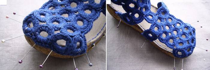 9. Приступаем к изготовлению макета будущих сандалий. Прикалываем вязаную часть к подошве портновскими булавками, чтобы иметь возможность примерить и оценить практичность новой обуви. Прикрепляйте детали верха к подошве таким способом, чтобы сандалии получились удобными для примерки.