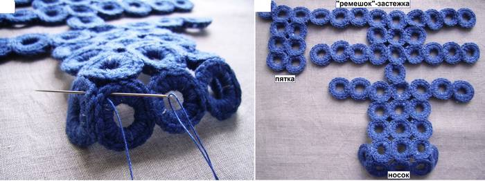7. Руководствуясь схемой соединения, сшейте между собой крайние мотивы в районе носка, это даст пальцам ног необходимое удобство при ходьбе. После сшивания всех мотивов вязаная деталь верха будет выглядеть так: