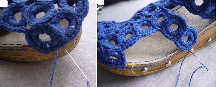 10. Если, после примерки, Вас в сандалиях все устраивает, приступайте к пришиванию вязаной детали к подошве. Начинайте пришивать с носочной части. Делайте несколько стежков в одном месте, чтобы шов был более крепким. Пришив носок, переходите к боковым деталям. В завершение пришейте пяточную часть.