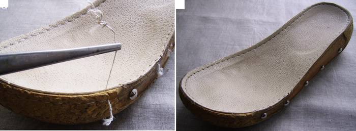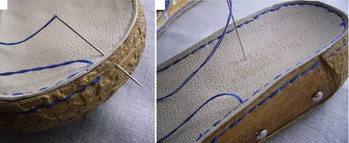 4. Специальной сверхпрочной обувной нитью сделайте вручную новый шов, прокладывая стежки в существующие фабричные отверстия. Пришивайте стельку к основанию по всему периметру подошвы.
