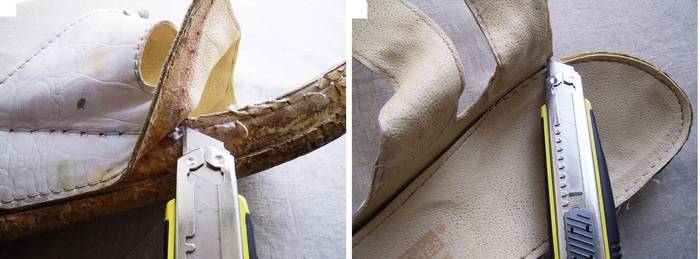 2. Подготовьте старую обувь для переделки, тщательно вымойте, высушите и приступайте к работе. Для начала, используя нож-резец, отделите кожаный верх от подошвы. Аккуратно отделяйте деталь верха, старайтесь не повредить подошву. Закончив работу, отложите верхнюю деталь, она нам больше не понадобится.