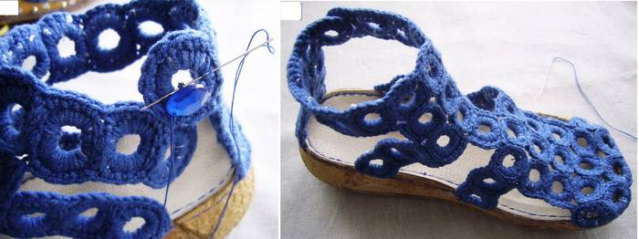 11. После того, как вязаная верхняя деталь прочно пришита к подошве, примерьте сандалию и наметьте место для пуговицы-застежки. Все пришито на свои места, основная работа закончена.