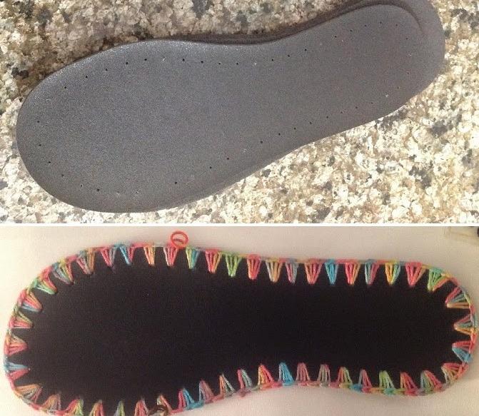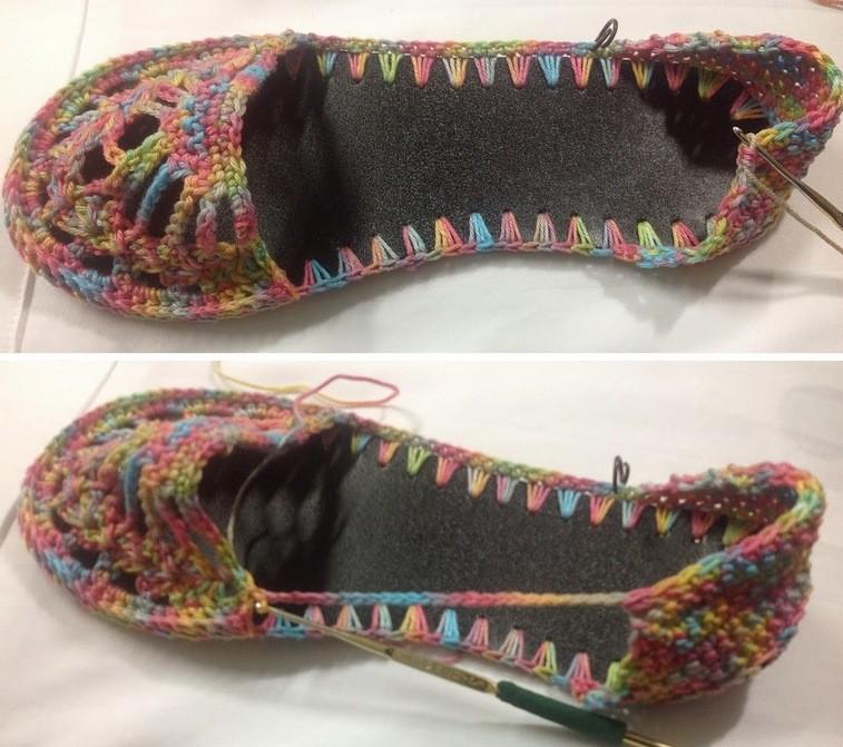 Обвяжите стельки крючком, используя отверстия, которые уже сделаны. Отметьте маркерами точки, чтобы направлять фиксирующую часть, которая связана отдельно.