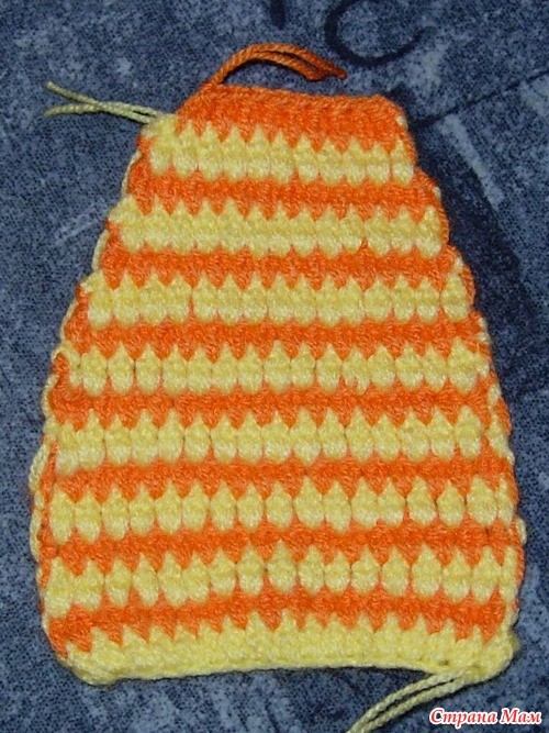 Теперь вяжем переднюю часть тапочка. Узор - пышные столбики. Для этого связала цепочку из 17 воздушных петель. В первом ряду в каждую воздушную петлю вяжем по 2 столбика с накидом и заканчиваем их одной петлей (то есть накид, втаскиваем петлю, вяжем вместе накид и вытащенную петлю, опять накид,опять вытаскиваем петлю, опять провязываем вытащенную петлю и накид, а затем провязываем вместе 3 петли на крючке). След.ряд - ниткой другого цвета, и столбики вяжем между столбиками предыдущего ряда,чтобы получился "шахматный" рисунок. Для того,чтобы ряды не сужались - в начале ряда вяжем 3 воздушные петли подъема, а в конце - 1 столбик с накидом. Должно получиться 10 рядов, то есть 5 одного цвета и 5 другого. Затем по краям сужаем, то есть в каждом ряду сначала и в конце не вяжем петли подъема и заключительный столбик, а сразу вяжем пышные столбики между столбиками предыдущего ряда. На нужной выоте, когда останется примерно 8 или 9 столбиком, закрыла вязание и нитку оборвала.