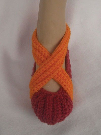 Ряд 23: Соед. ст. в каждый ст. ряда до одного ст. перед первым ст. б/н. провязать столбиком б/н след. соед. ст. и след. ст. б/н вместе, ст. б/н в каждый ст. ряда до послед. 2 ст., провязать столбиком б/н послед. 2 ст. вместе, соед. ст. в след. 2 ряда Подошвы. ПР = 26 ст.
