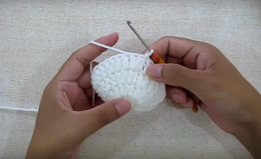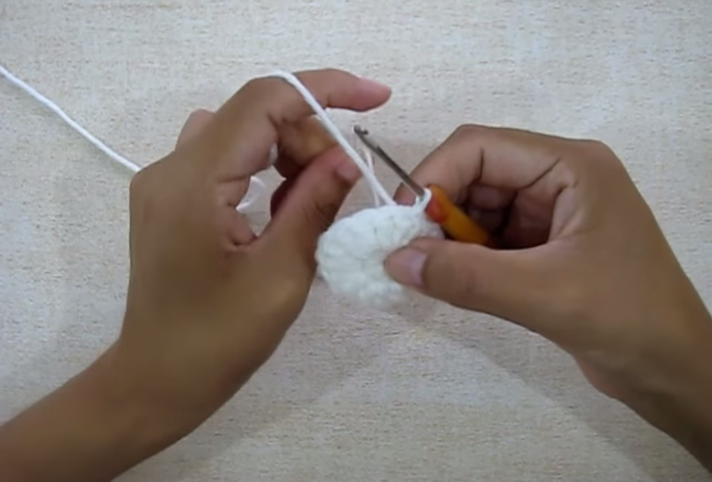 1-й ряд: взять крючок 3.5мм и сделать круг из 5 воздушных петель, провязать 9 столбиков с накидом, стянуть нить, провязать соединительный столбик.