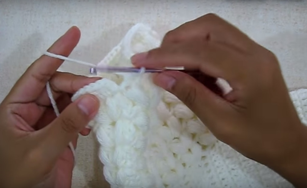 1-й ряд:провязать 3 возд.петли,накид на крючок,протянуть рабочую нить через петлю .Повторить процесс с накидом и вытягиванием нити через петлю четыре раза.Затем рабочей нитью провязать все петли на крючке , кроме последней.Последним шагом будет провязывание двух петель вместе, чтобы осталась одна петля на крючке.Таким образом получился первый пышный столбик. Дальше набрать 1 возд.петлю и в этой же петли провязать такой же пышный столбик.Пропустить две петли( 1 ряд основы), в следующей петле все повторить.Так провязать 10 раппортов.