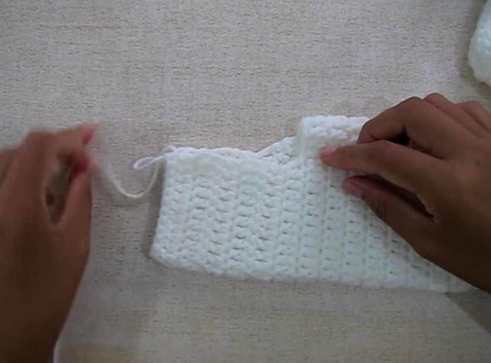 В конце основы оставить длинную нить,вывернуть работу на изнаночную сторону, сложить вдвое, вдоль последнего ряда сделать задний шов.