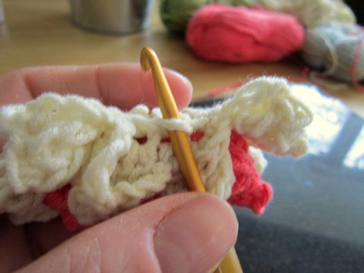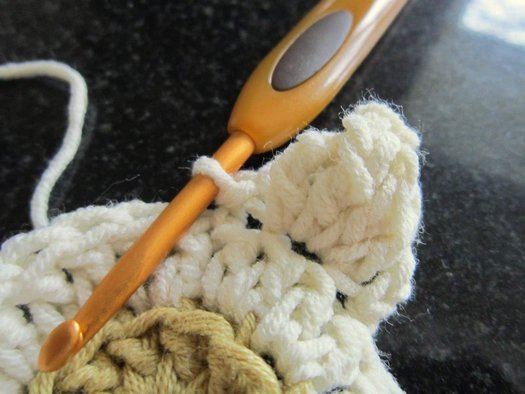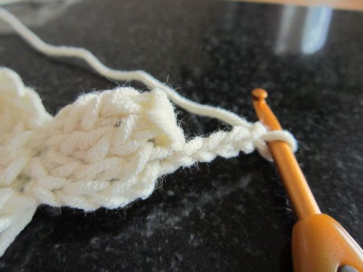 Ряд 2: за заднюю дужку петли присоедините нить белого цвета (и далее все столбики провязывайте только за заднюю дужку), выполните подъем из 3 ВП, в ту же петлю СН, далее *в след. петлю 2 СН, от * повторить еще 10 раз, завершить ряд СС в последнюю из начальных ВП (= 24 петли).