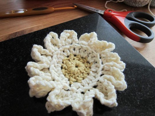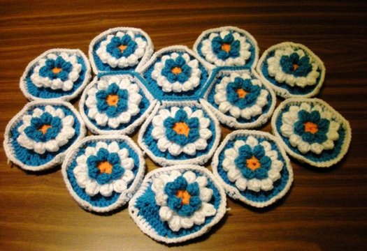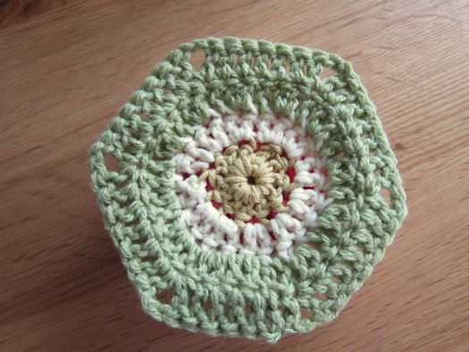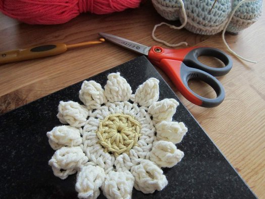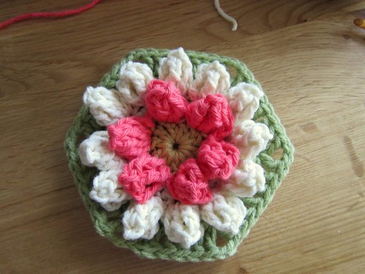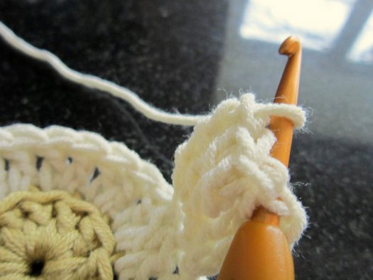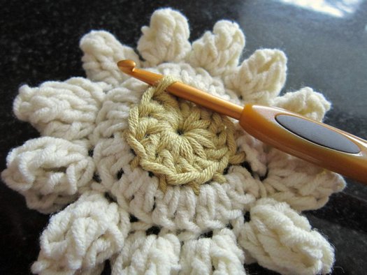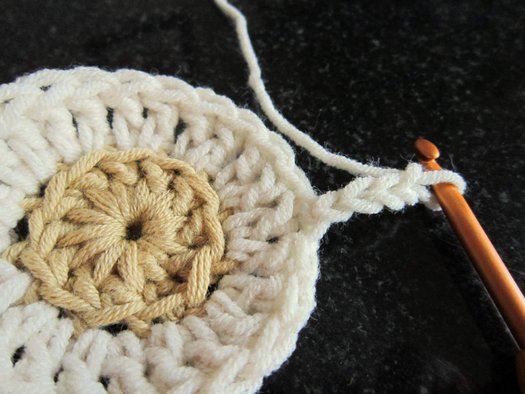 Для превращения цветка в шестиугольный мотив продолжаем вязание.