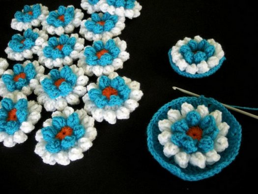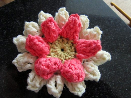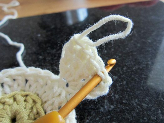 Ряд 4: присоединяем нить другого цвета за переднюю дужку петли ряда 1 и приступаем к вывязыванию внутреннего ряда лепестков.