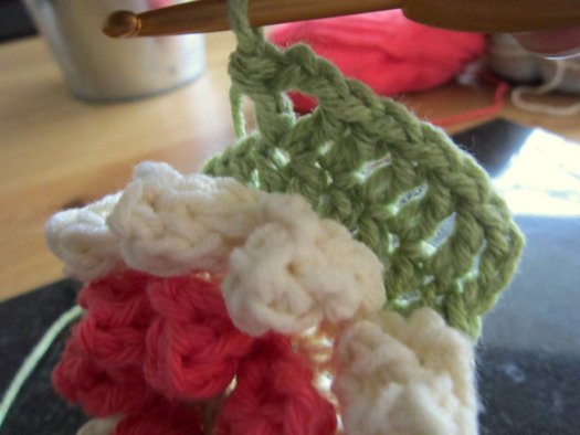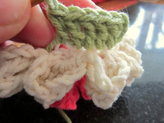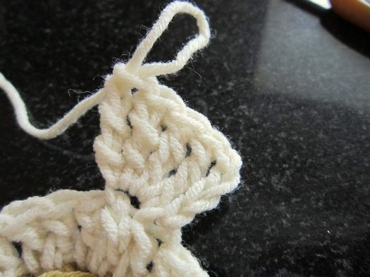 Ряд 5: присоединяем пряжу нужного цвета с изнаночной стороны цветка за заднюю дужку петли ряда 3.