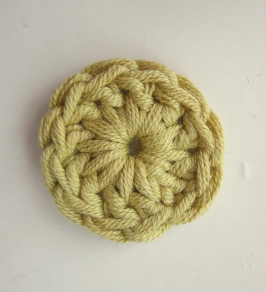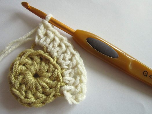 Начало работы: провяжите 4 ВП нитью желтого цвета, замкните их в кольцо при помощи СС.